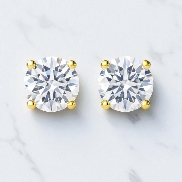 Pure light, pared back to essentials. Each stud centres a round brilliant moissanite cut for high dispersion and diamond-bright fire held in a fine four-claw basket of yellow gold. The low-profile setting sits close to the lobe so the stones do the talking; polished posts and secure butterfly backs keep them effortless from day to night. Consider them modern heirlooms: impeccably made, hypoallergenic, and designed to be worn on repeat.