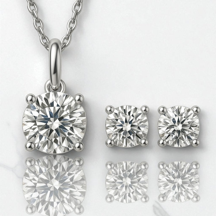 Quiet luxury, perfectly balanced. The Astra set marries a luminous 1.00 ct round-brilliant moissanite pendant with impeccably matched 0.50 ct studs (each). Each stone is elevated in a slim four-prong mount to maximise fire and scintillation, all crafted in 925 sterling silver plated in 18k white gold for a cool, mirror-bright finish. An everyday heirloom that reads polished from brunch to black tie.