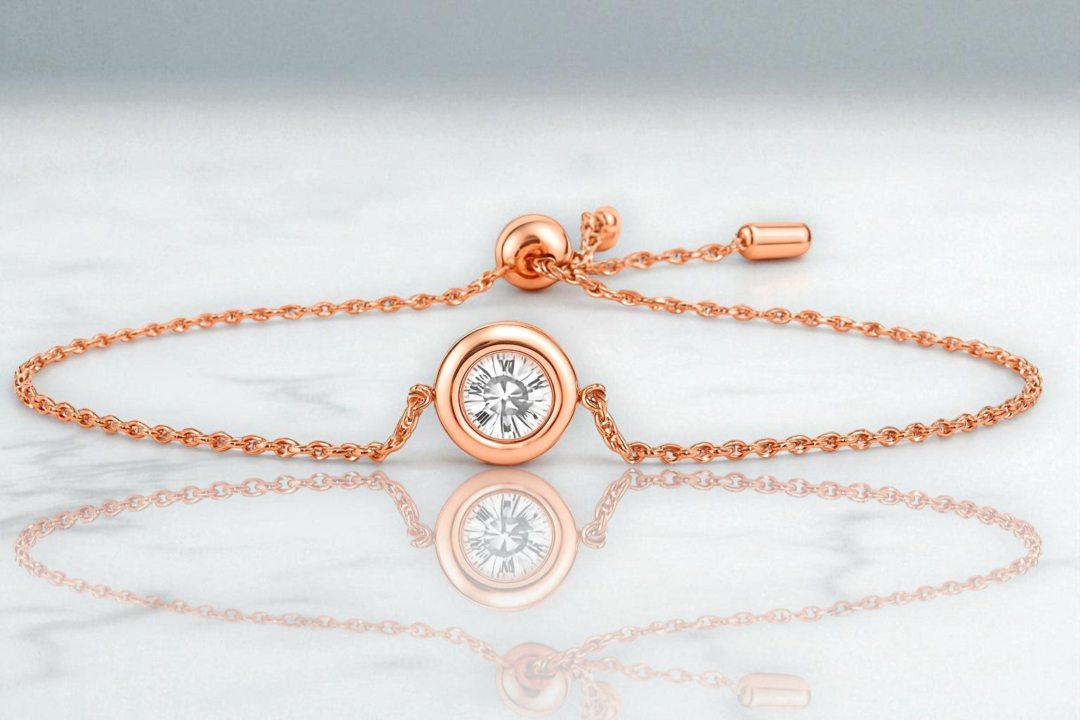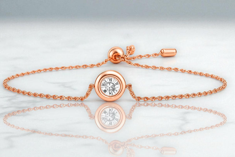 A single flash of light, perfectly framed. The Aura Bezel Bracelet centers a round brilliant stone in a sleek bezel that floats along a fine 18k rose gold–plated sterling silver chain. The sliding bolo clasp glides for a custom, feather-light fit elegant on its own, quietly radiant in a stack.