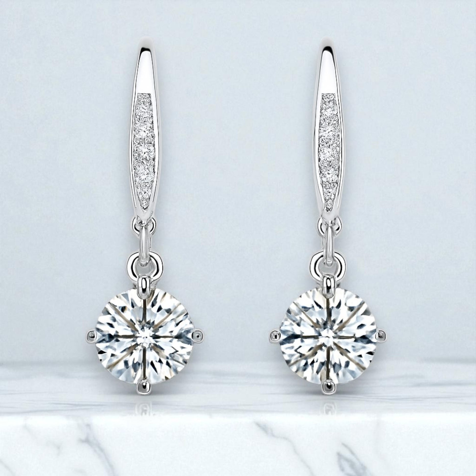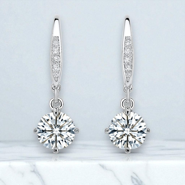 Sleek, tapered pavé bars release a bright round brilliant moissanite, articulated to catch the light with every turn. The silhouette is refined and airy the pavé adds a fine dusting of sparkle while the solitaire delivers a crisp, white flash. Finished in polished white metal with balanced posts and secure butterfly backs. Equal parts minimal and high jewellery.