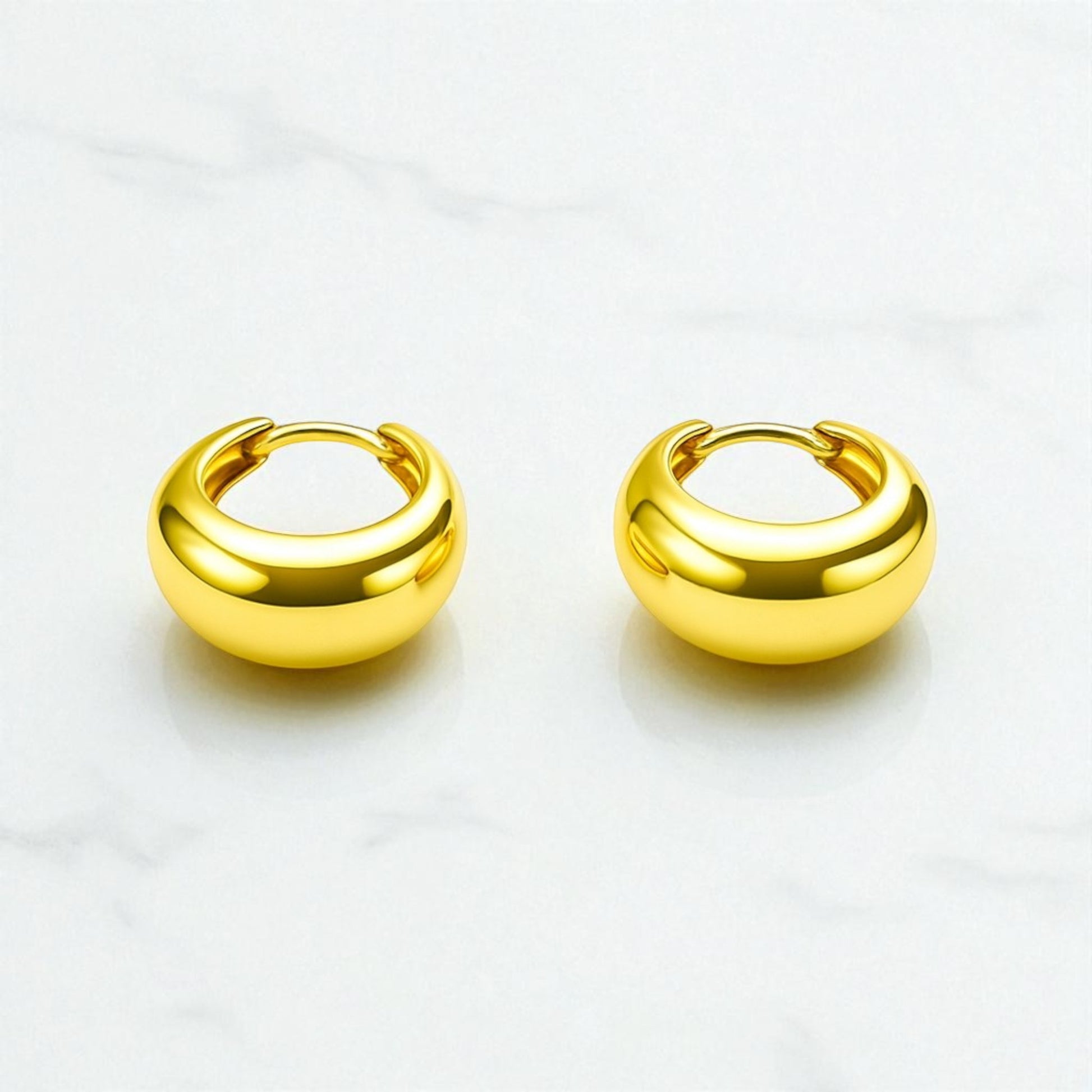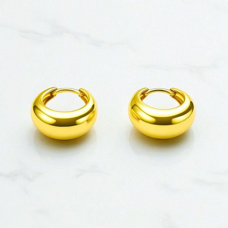 A sleek curve of high-polish gold, inflated to a soft dome that hugs the lobe with quiet drama. These compact huggies click closed with precision and deliver mirror-shine from every angle minimal, sculptural, and unmistakably luxe. Wear solo for a clean statement or stack them with thinner hoops for depth.