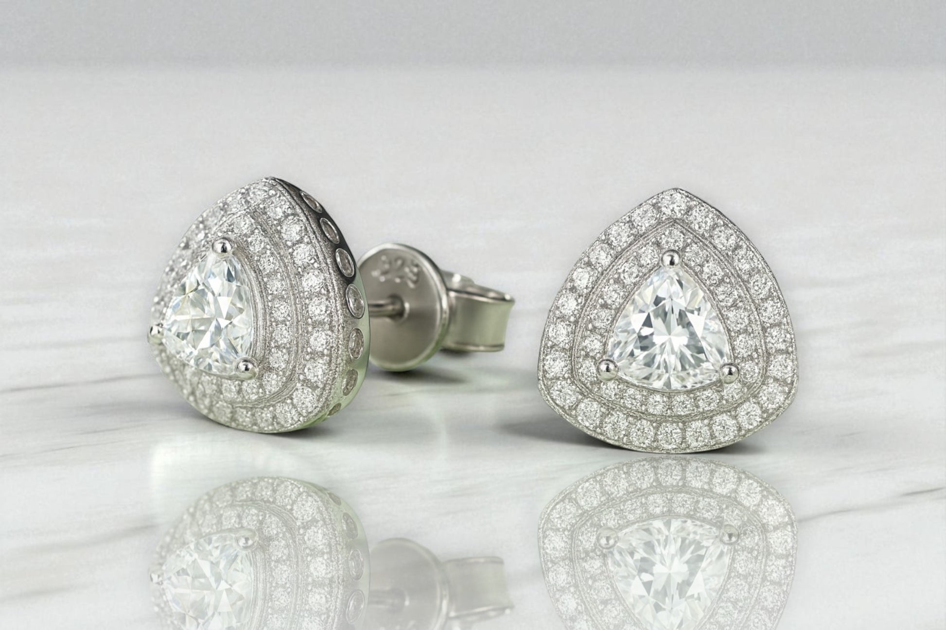 A modern take on old-world glamour. A radiant trillion-cut moissanite is cradled in a sculpted basket and framed by three tiers of micro-pavé for a luminous, high-jewellery finish. Meticulous setting and mirror-polished metal give these studs a bold, architectural sparkle that elevates everything from a silk blouse to evening black tie.